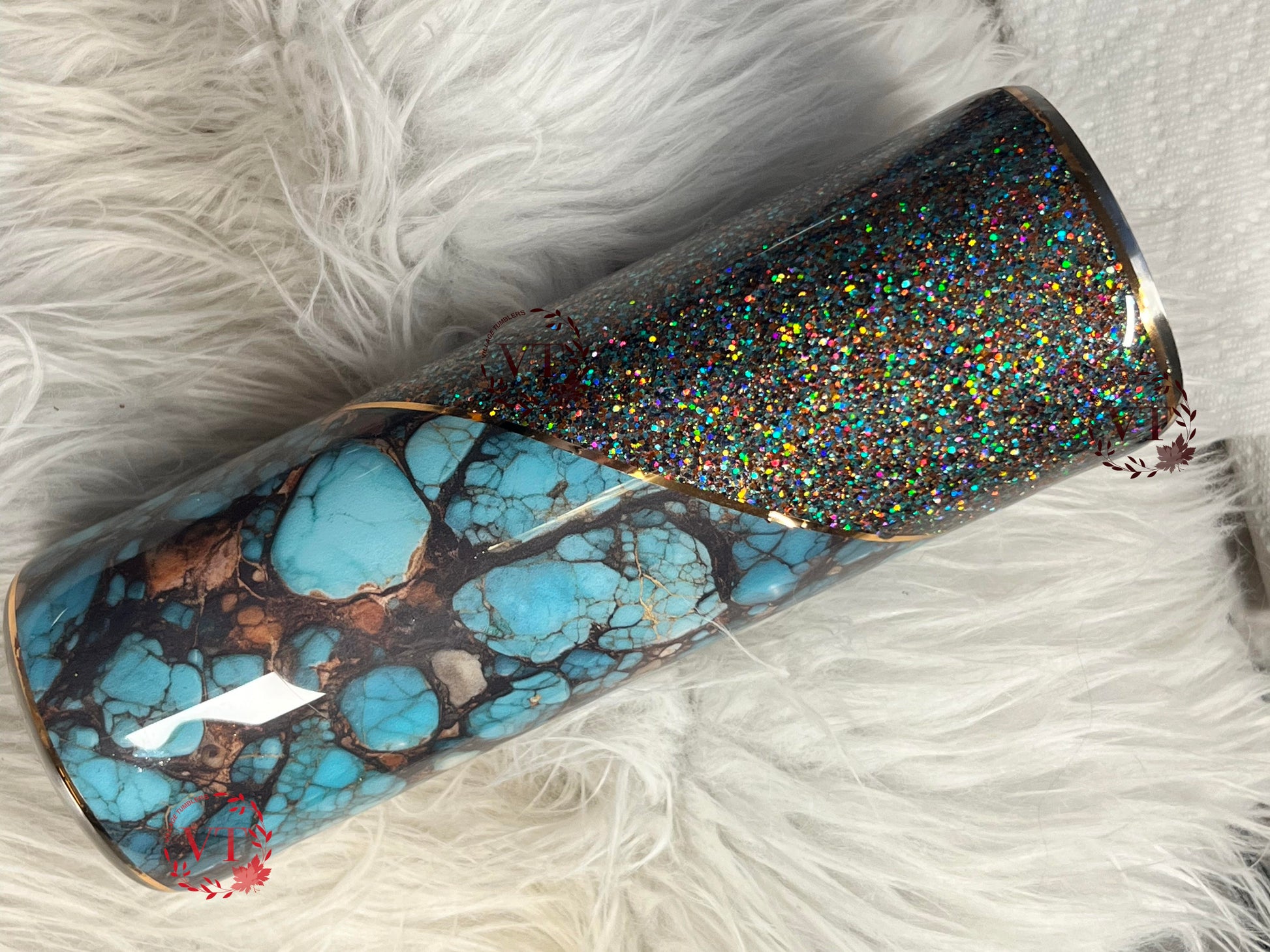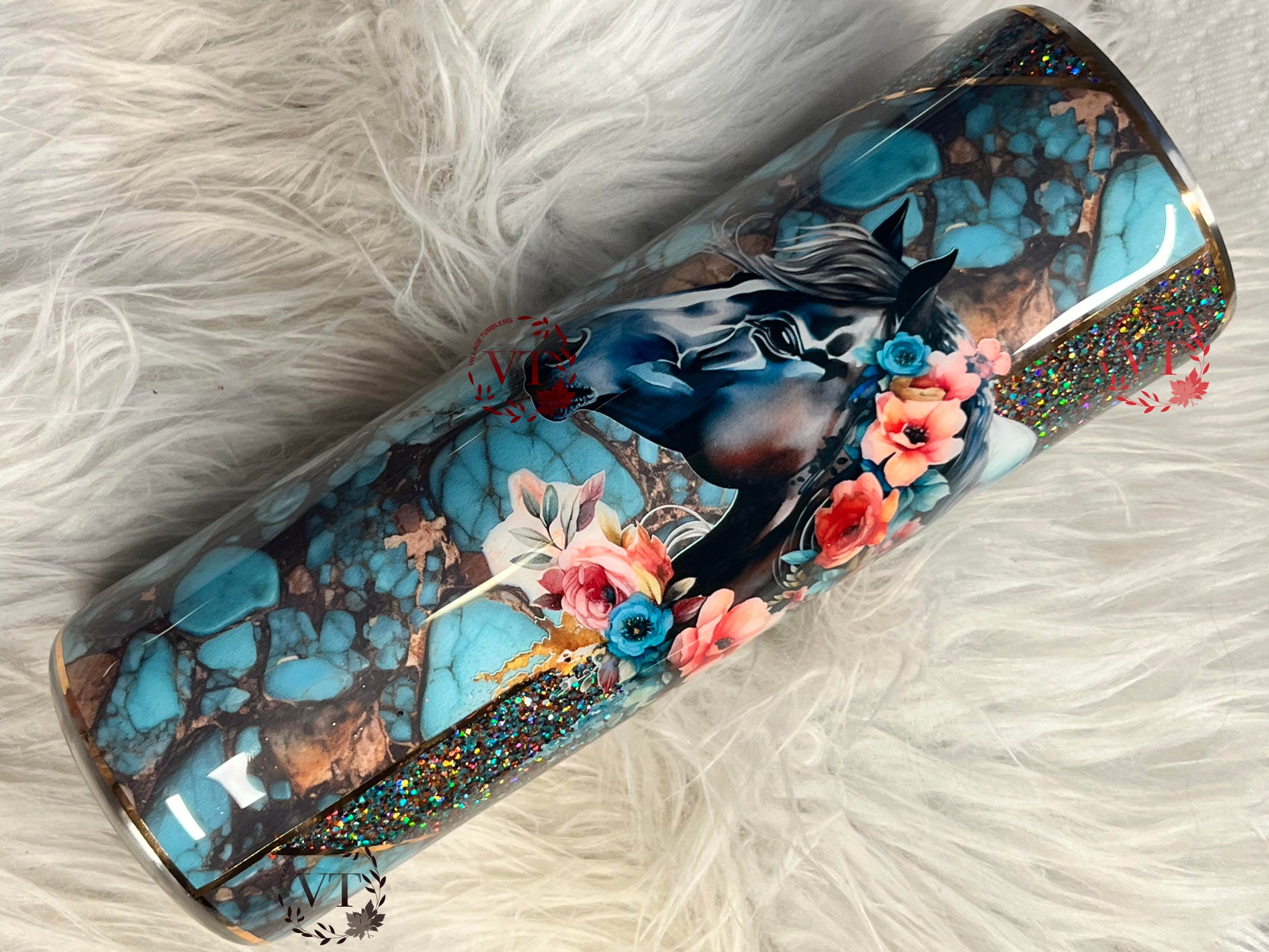 Introducing the 30 oz Western tumbler, perfect for keeping your drinks at the ideal temperature. Made with stainless steel and a mesmerizing multi-color glitter and turquoise pebble vinyl design, accented with a playful horse head decal. Keep it cool or heat it up, this tumbler has got you covered.