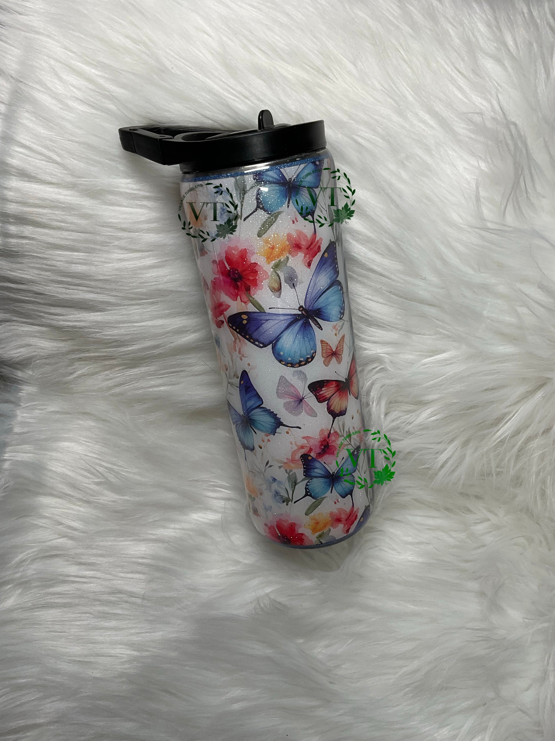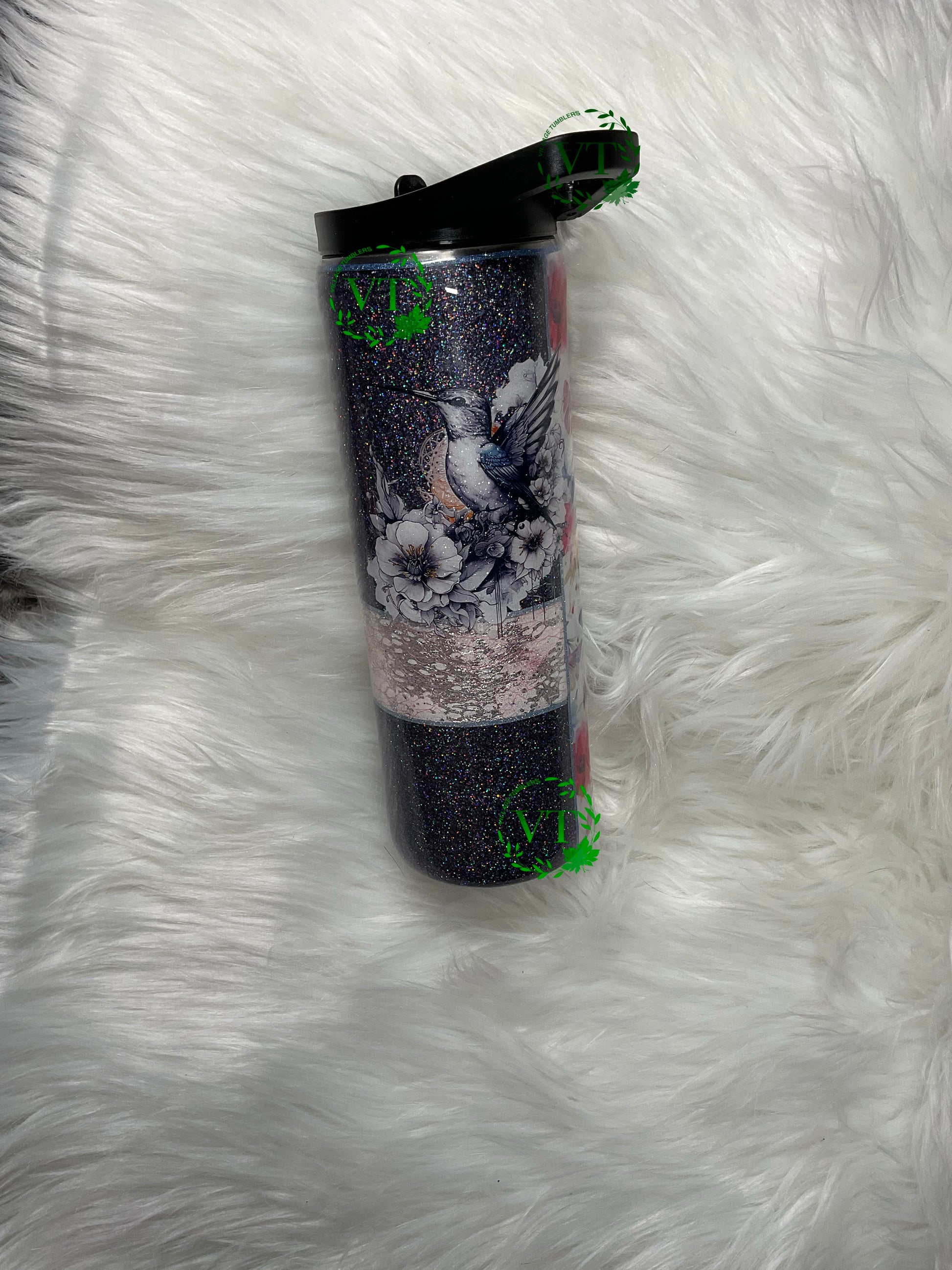 Get ready to flutter and hum with our 20 oz duo tumbler! Made with stainless steel, it comes with 2 lids to keep your drinks at the perfect temperature. One lid for hot beverages and the other with a built-in straw for your cold drinks. Half butterfly vinyl pattern, half dark blue with a lace strip and a beautiful hummingbird decal. Not for dishwasher or microwave- hand wash only. Sip in style and convenience!
