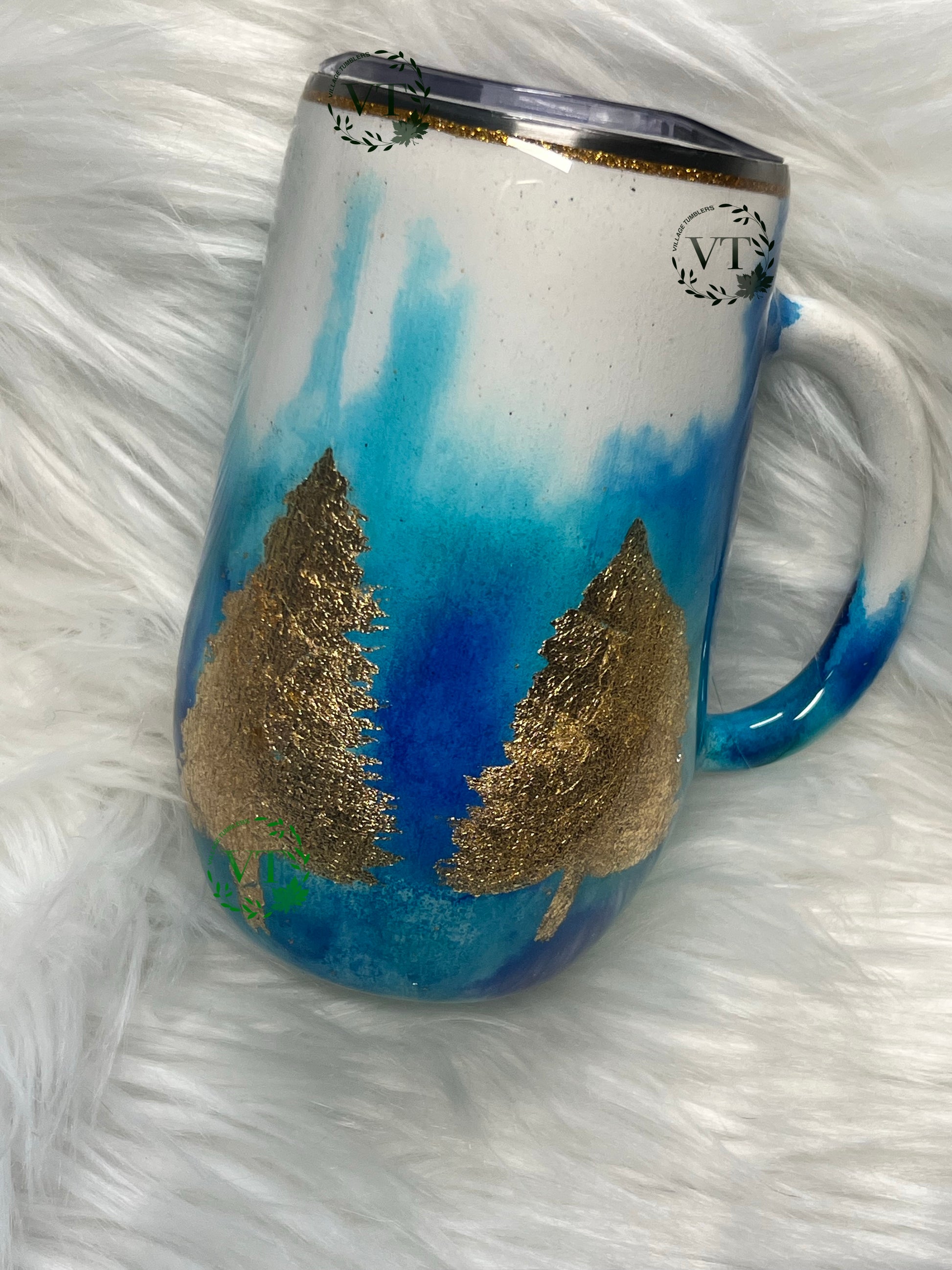 Sip your morning brew from this quirky 16 oz mug #151! Crafted from stainless steel, this adorable mug features a charming blue ink pattern with gold embellished trees. Perfect for any drink, but hand wash only.
