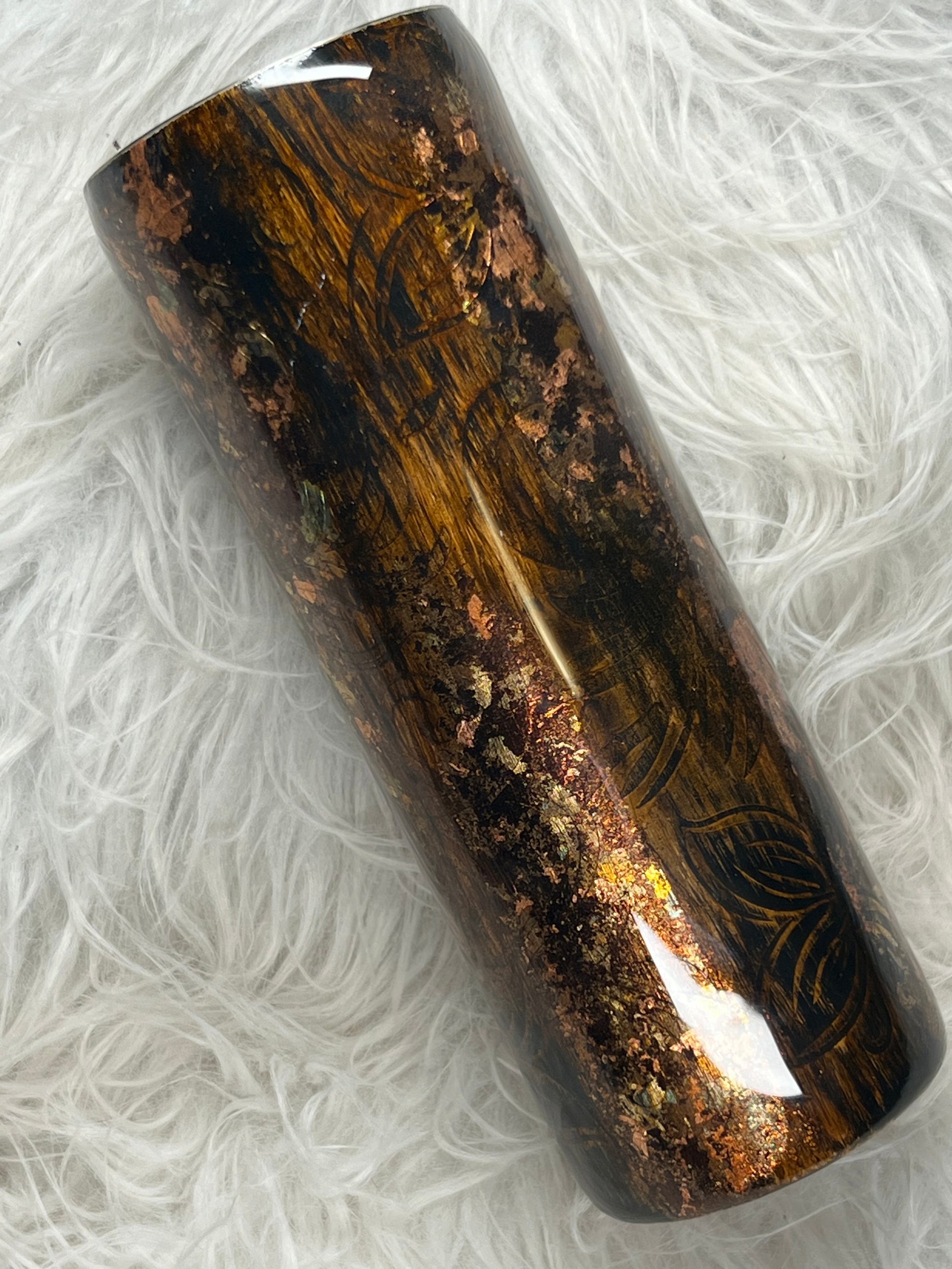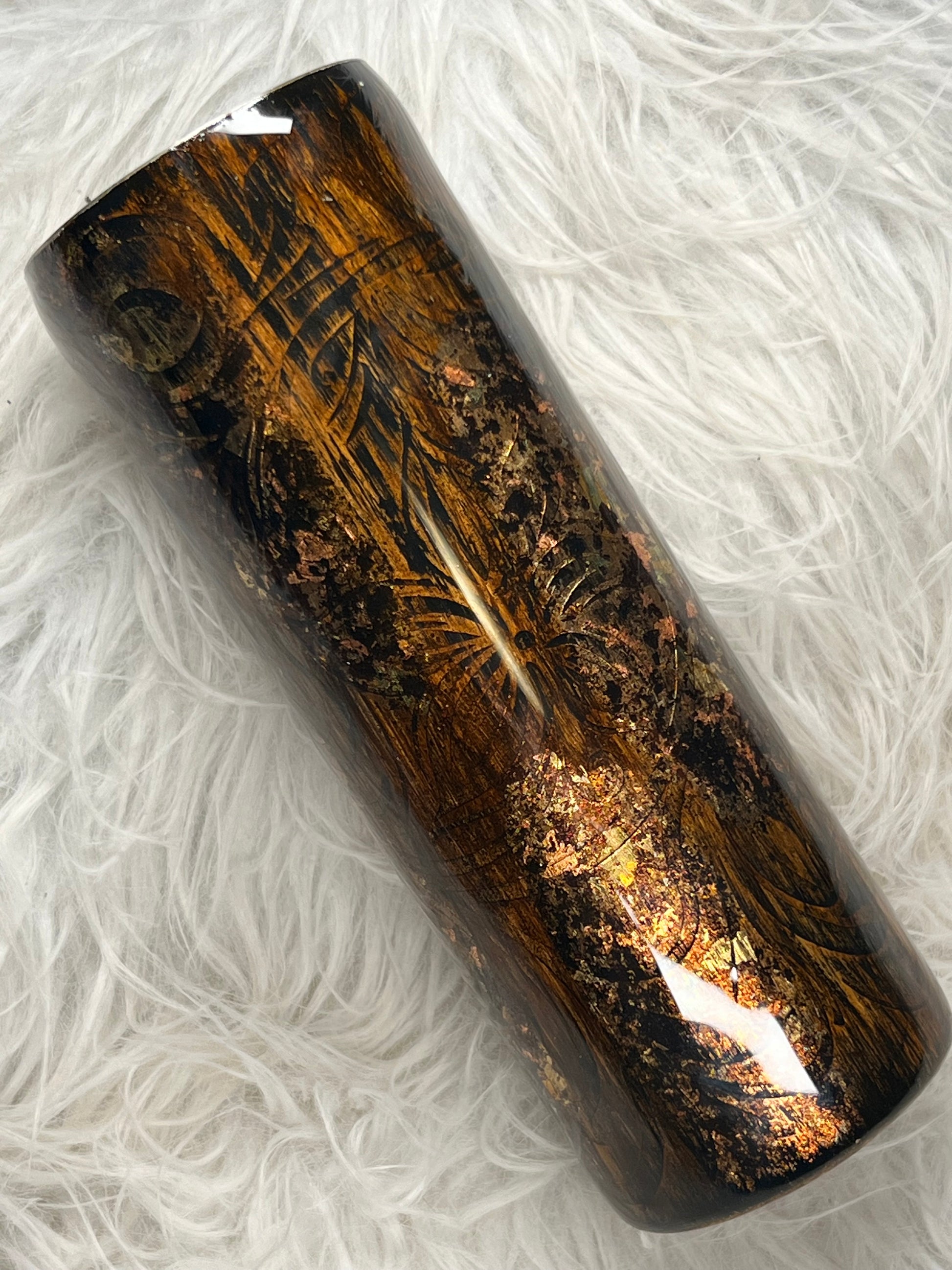 Quench your thirst in style with our 30 oz stainless steel tumbler. Its amazing wood grain and floral antiqued design adds a touch of foil for added charm. Perfect for both hot and cold beverages. Satisfy your cravings for both fashion and function with 136.