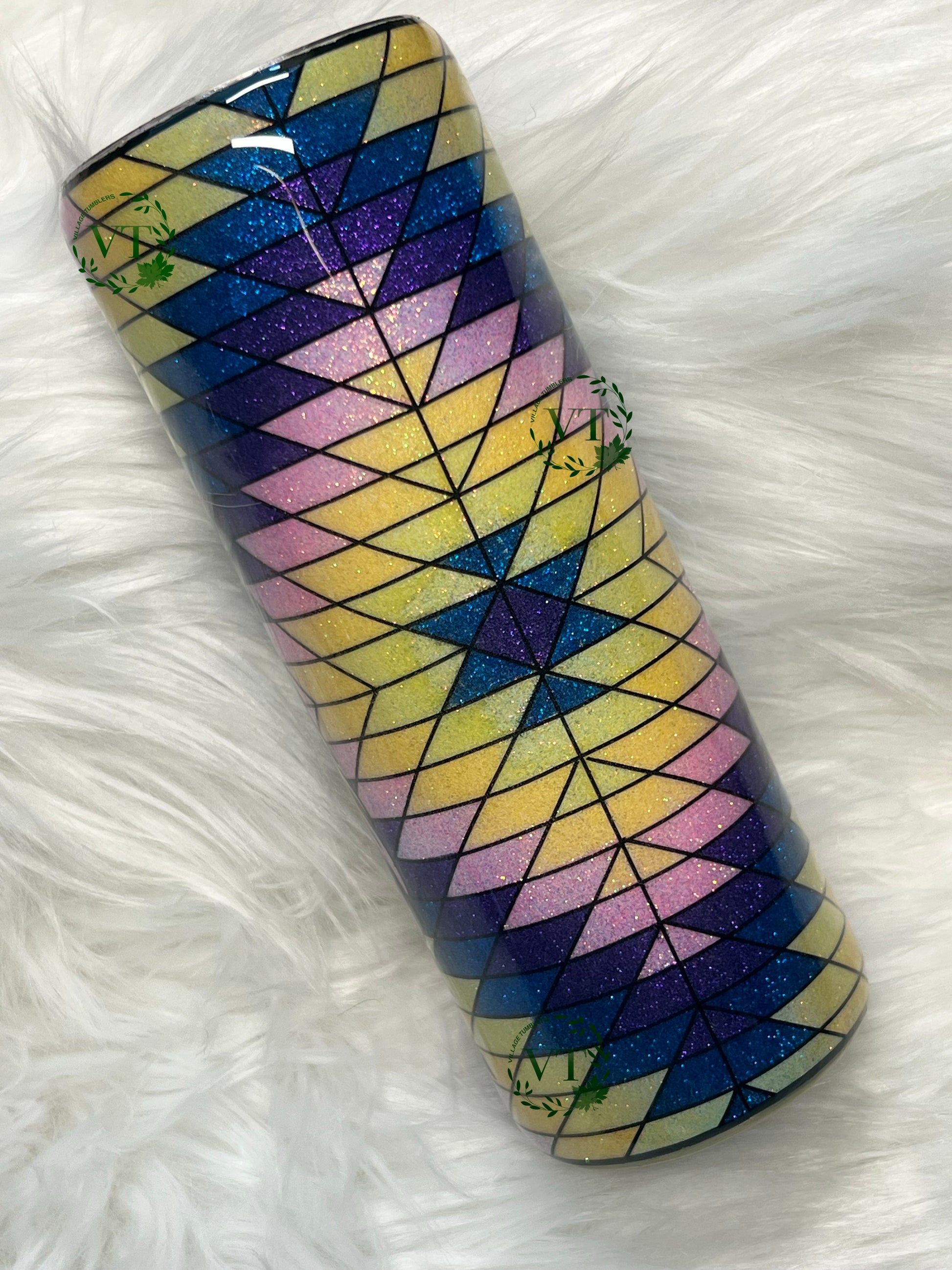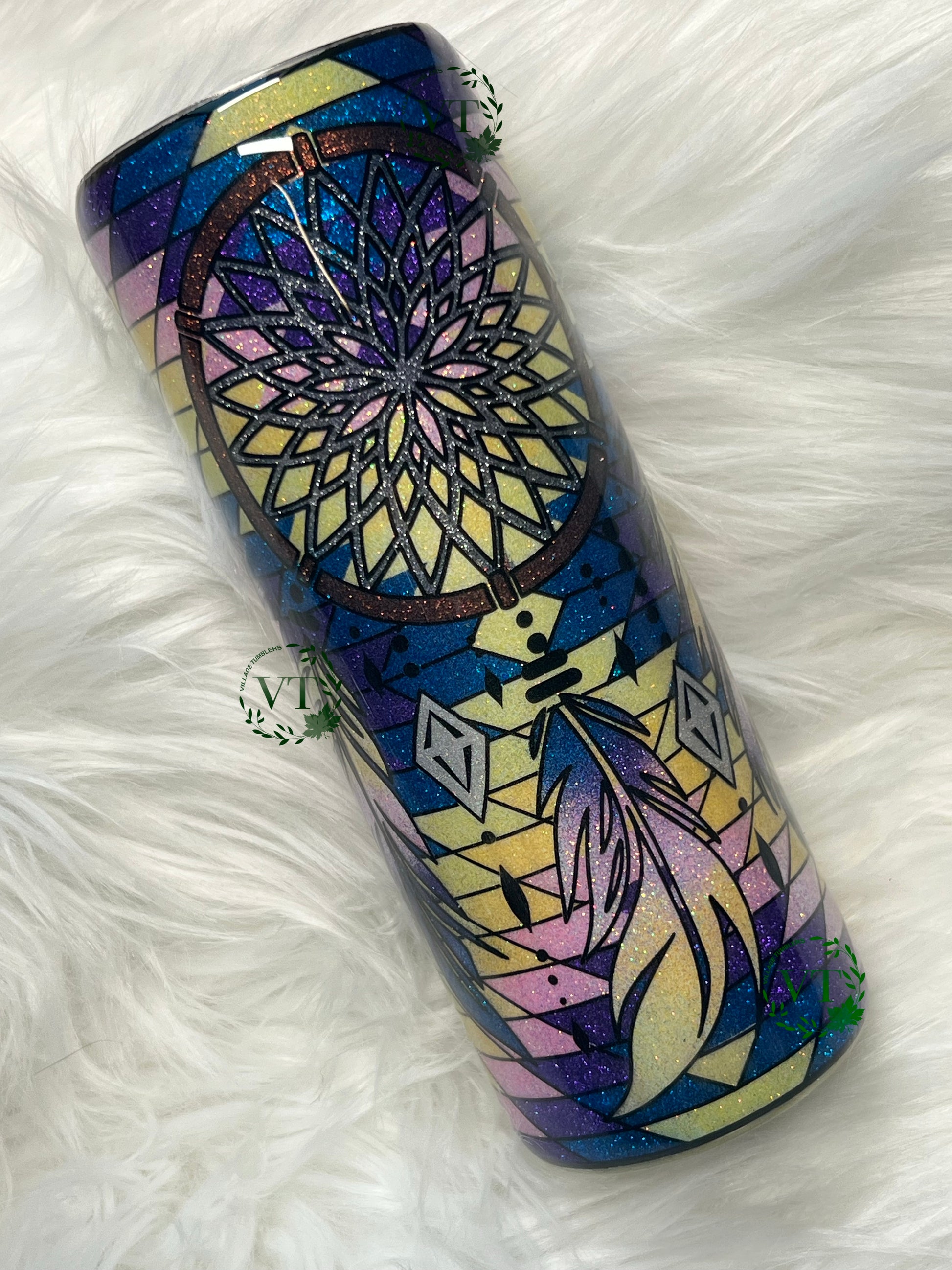 Indulge in quirkiness with our 20 oz Duo. This absolute stunner features two lids, one for your hot drinks and another with a built-in straw for cold sips. Its dream catcher design with multi-color glitter is sure to catch your eye. Hand wash only, this mug is definitely not microwave or dishwasher safe.