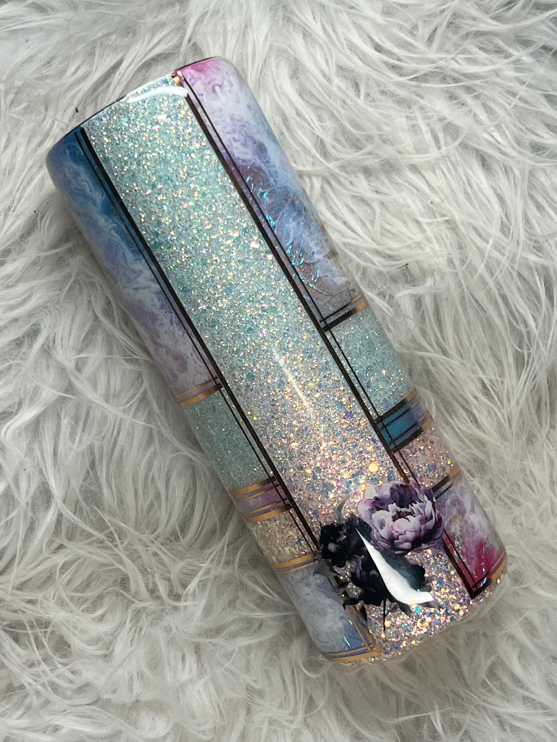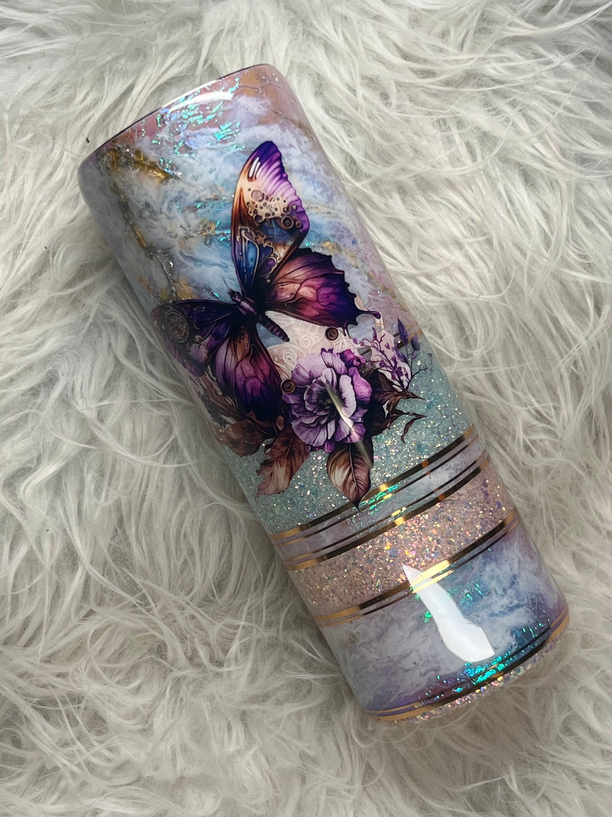 Introducing the 20 oz Duo, the perfect tumbler for all your beverage needs. Made with durable stainless steel, it features two lids for hot and cold drinks. The opal design with a glitter fade of light pink to light teal, accented with a stunning purple butterfly, is sure to turn heads.