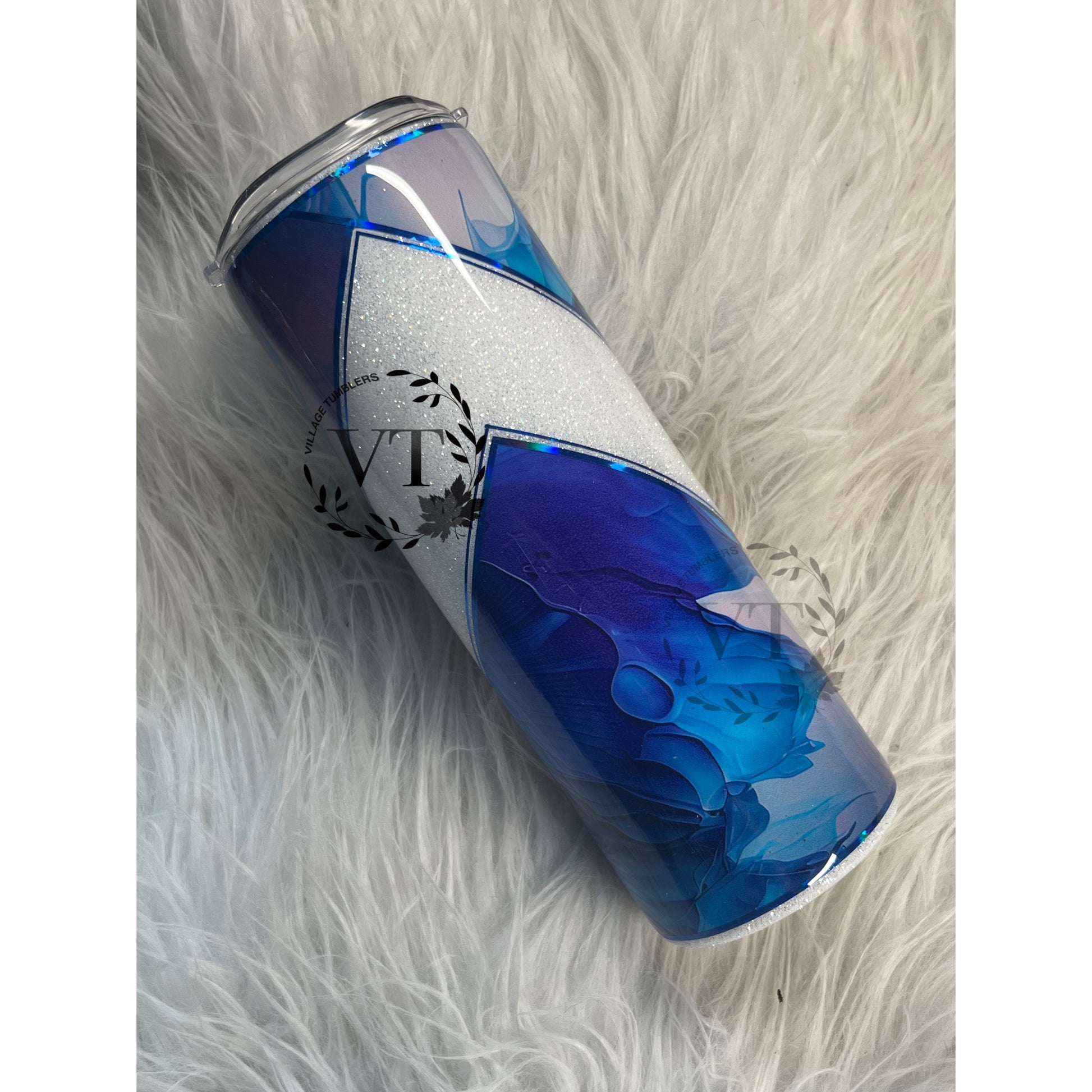 Stay cool and look cool with our 20 oz stainless steel water bottle. This bottle is perfect for blue lovers with its beautiful blue and white ink swirl style vinyl with white glitter. Keep your hot drinks hot and your cold drinks cold in style. (Hydrate and elevate with a touch of blue!)
