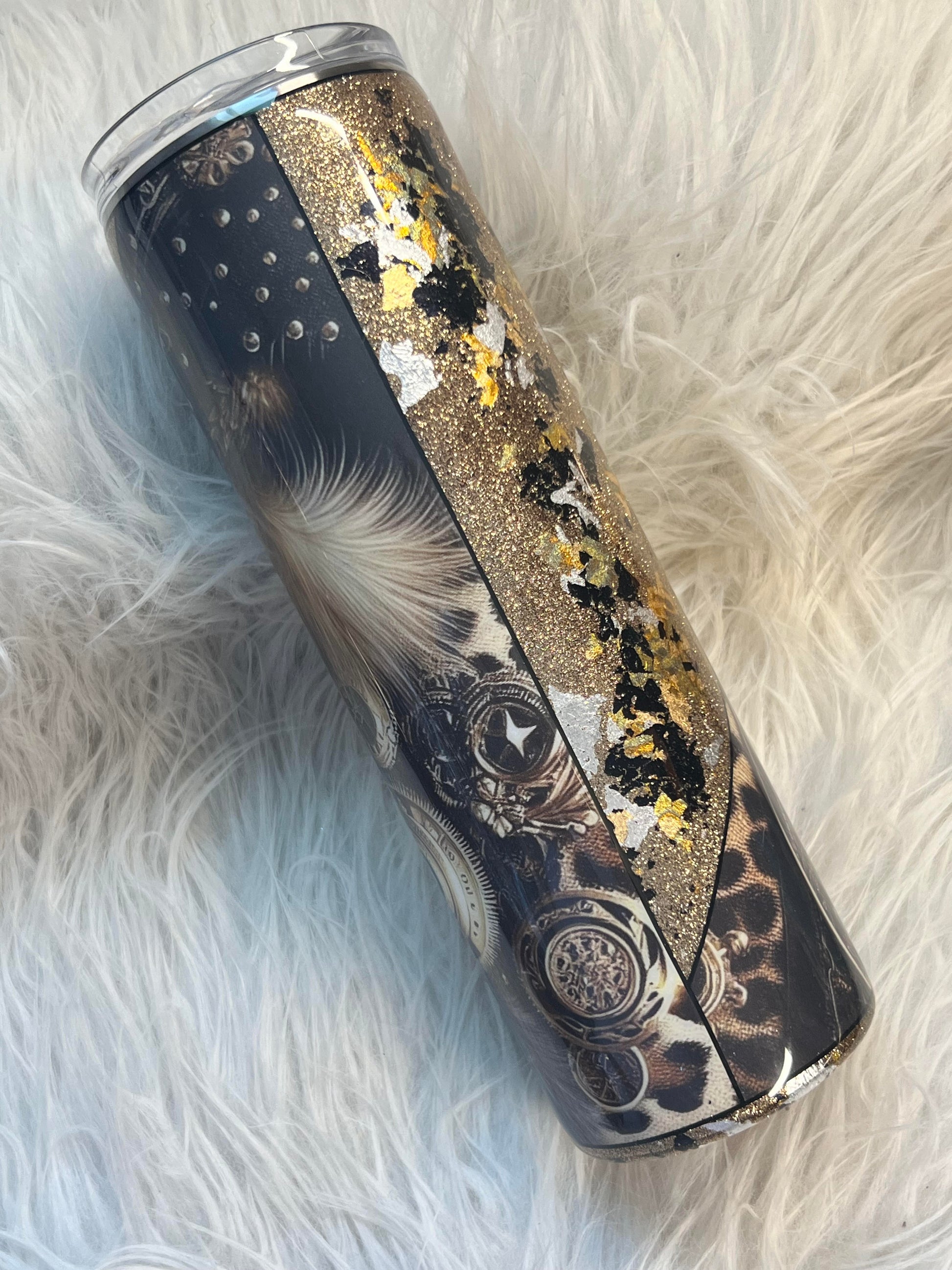 Stay cool and stylish with our 30 oz steampunk stainless steel tumbler. Perfect for hot or cold drinks, it's designed with a unique black, gold, white, and copper foil pattern. Keep your drinks at the perfect temperature while making a fashion statement. Cheers!