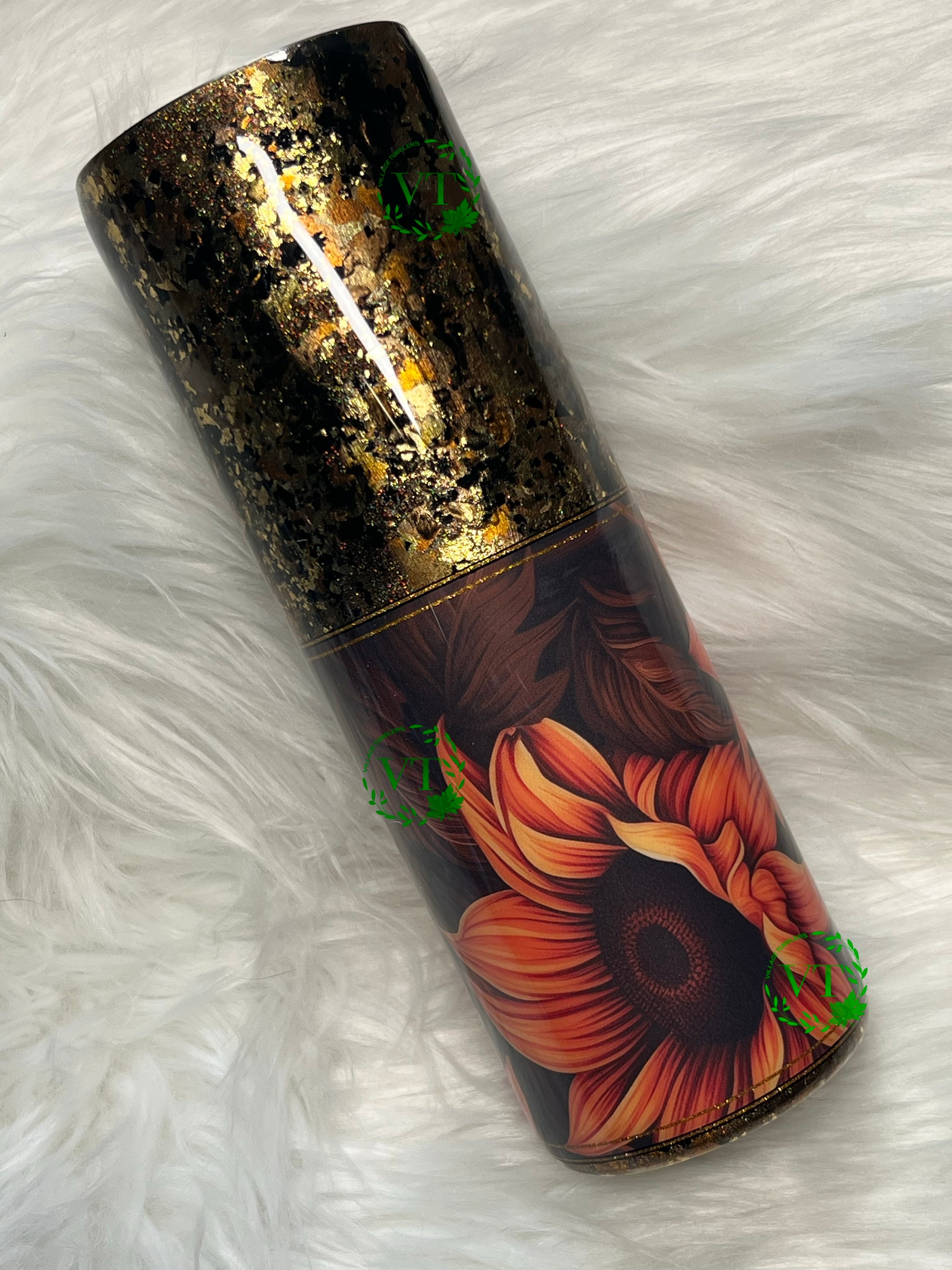 Get your daily dose of sunshine with our 30 oz stainless steel tumbler featuring a vibrant sunflower design with copper, black, and gold foil. Perfect for keeping drinks hot or cold, just be sure to hand wash for long-lasting use. Who says practical can't be stylish? (Hint: not us!)