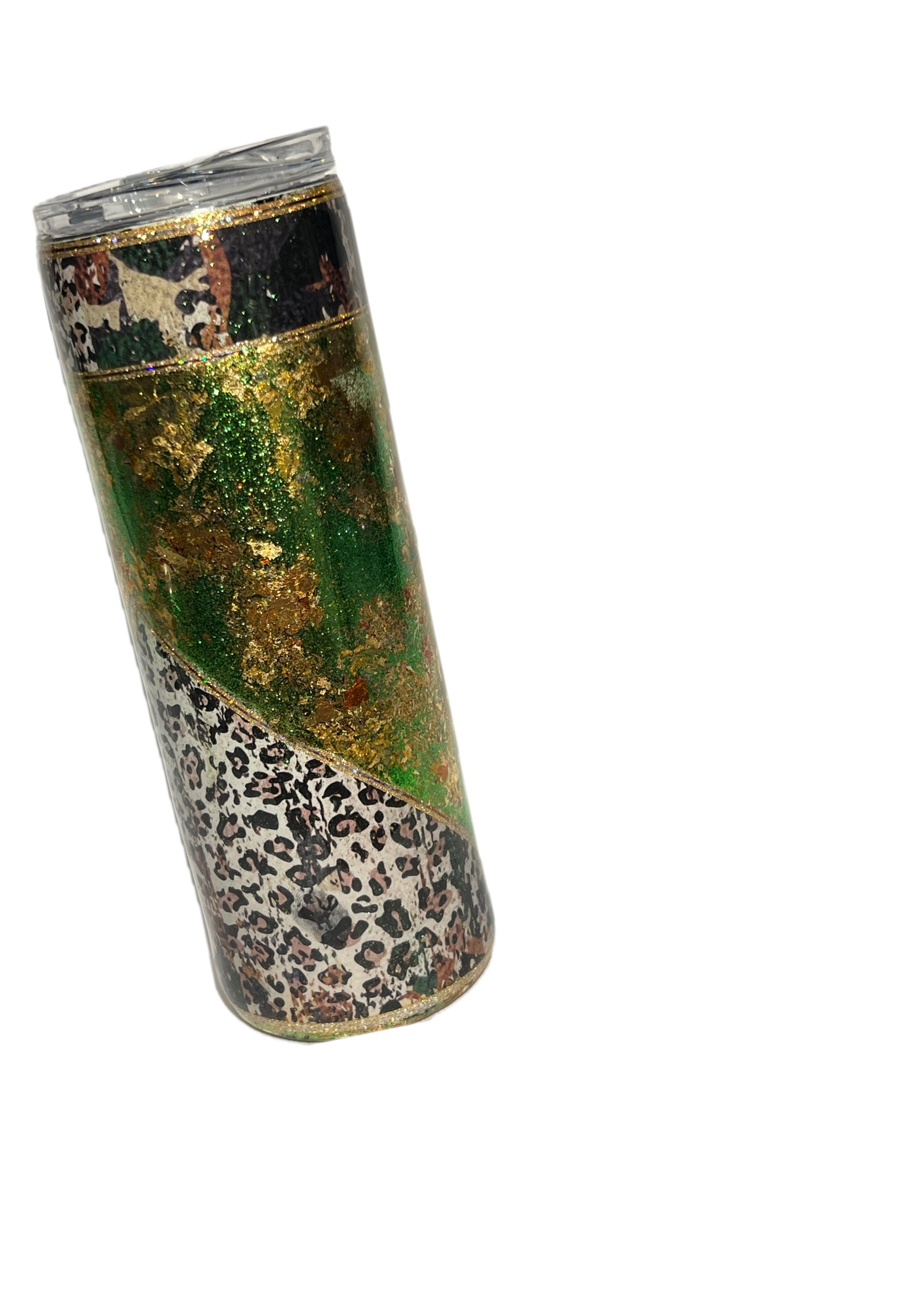 Stay wild and hydrated with our 20 oz stainless steel tumbler. Perfect for keeping your hot drinks hot and your cold drinks cold. With a fierce animal print vinyl and a splash of green and gold foils to add some fun to your drinkware collection.
