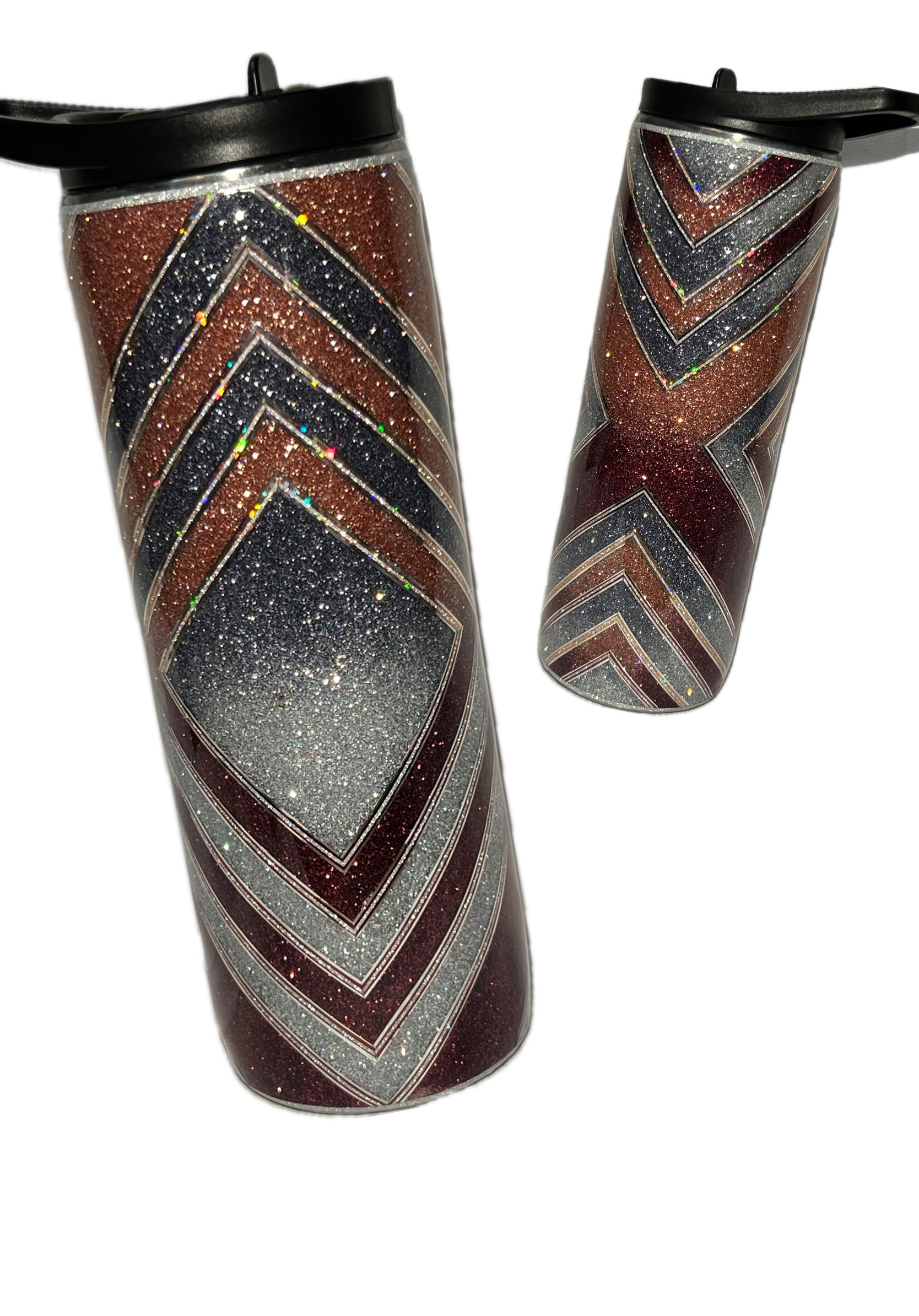 Introducing bouji X - the 20 oz duo tumbler with 2 lids for both hot and cold beverages! Enjoy your drink in style with the burgundy and rose gold glitter pattern on one side and the sleek slate grey and silver pattern on the other. Stay hydrated and stunning with Bouji X. (Pun intended)