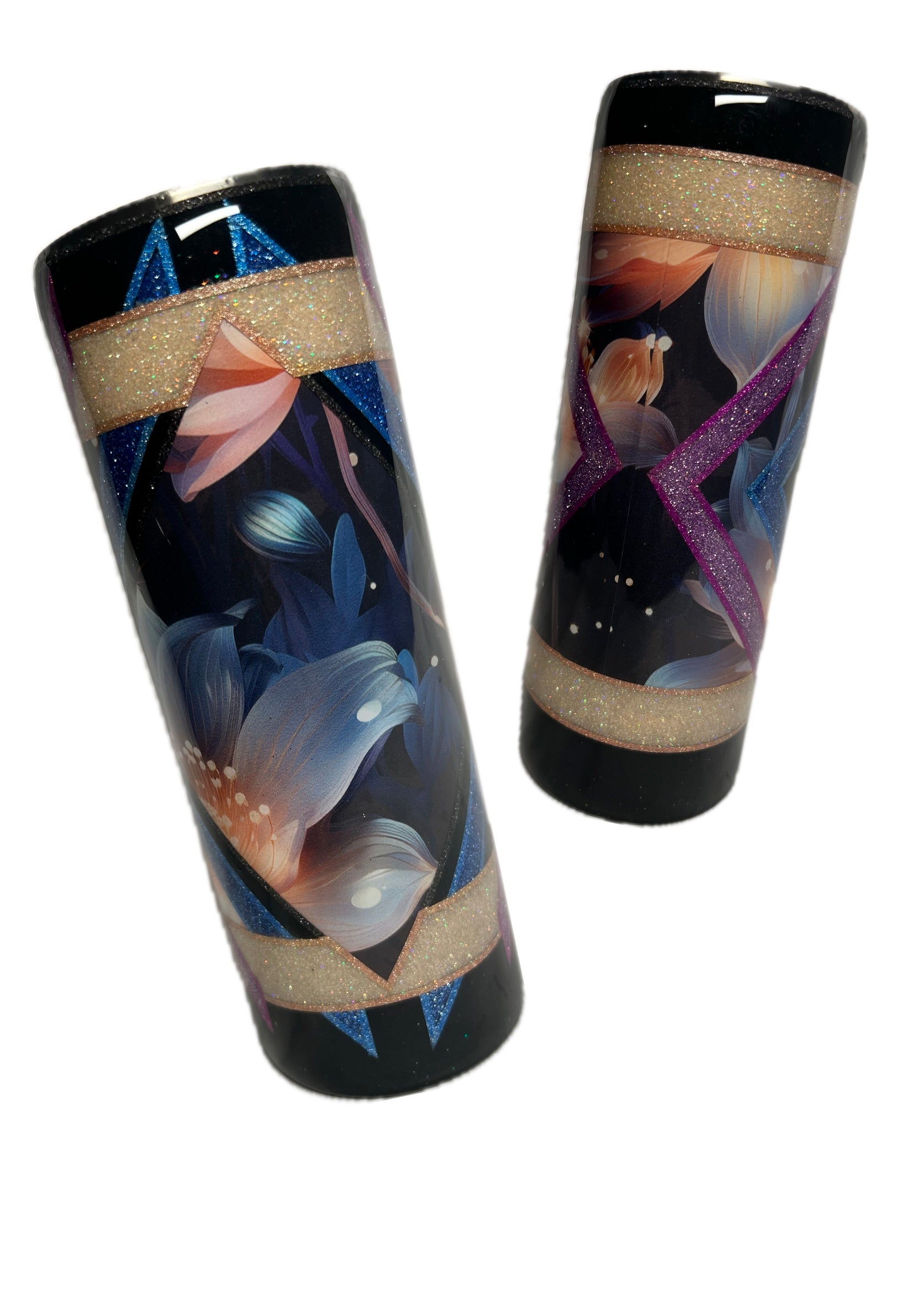 Get ready to sparkle with our Glitter and Vinyl tumbler! This 20 oz duo stainless steel tumbler features a mystical floral vinyl design with blue, purple, and glowing-in-the-dark peach glitter. Plus, it includes two lids for both hot and cold drinks. Sip in style and make a statement.