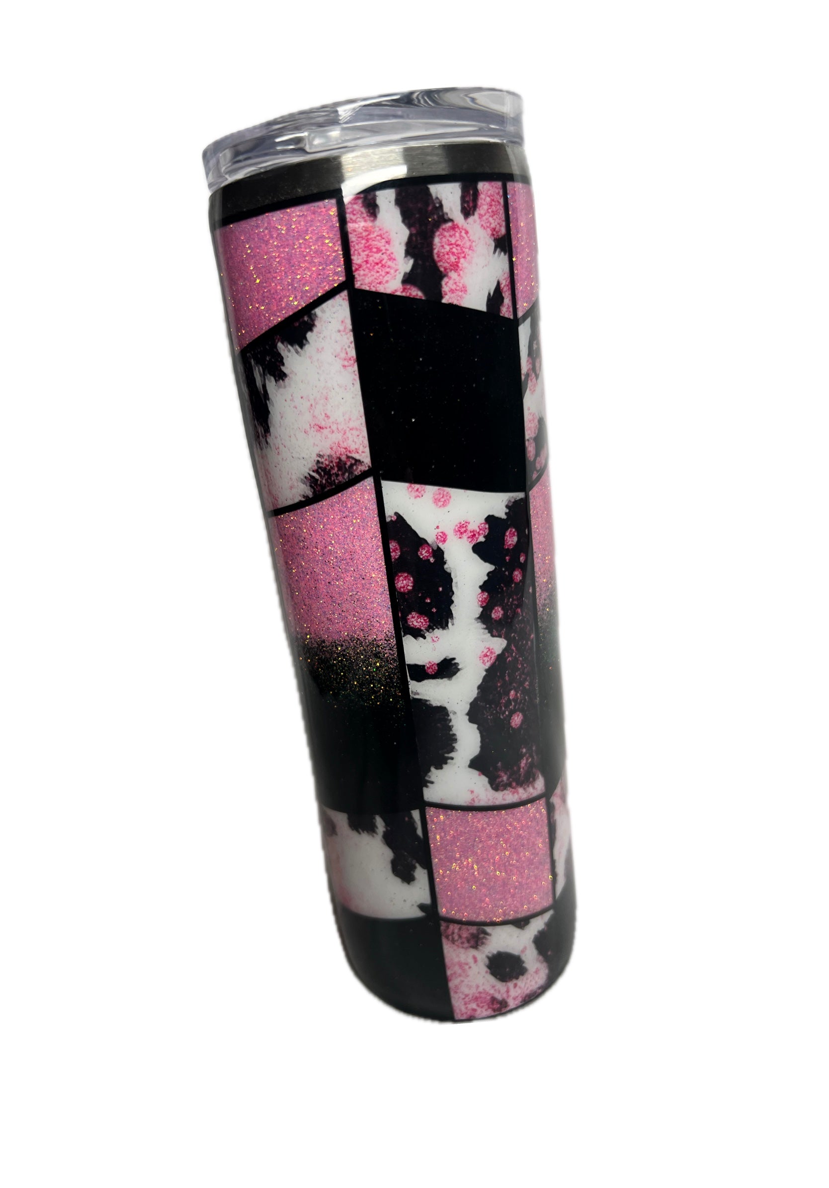 Add some sparkle to your daily routine with our Glitter and Vinyl tumbler! This 30 oz stainless steel tumbler features a cow print vinyl and a fun pink and black glitter fade. Keep your drinks hot or cold while adding a touch of playfulness to your day. Drink up!