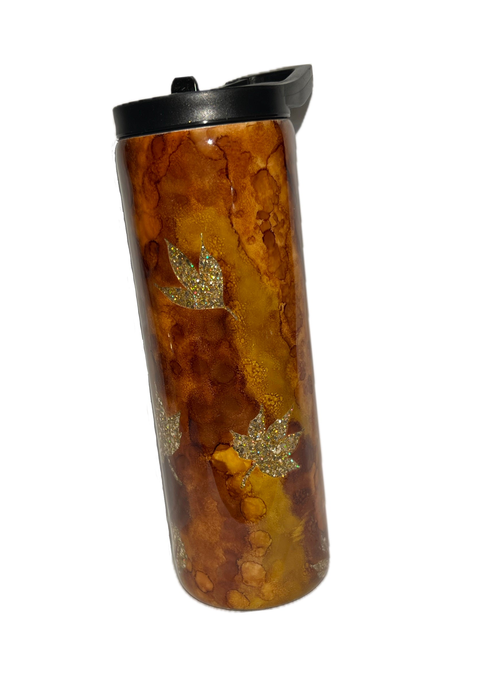 Introducing the peek a boo fall leaves mug - a 20 oz duo with 2 lids for both hot and cold beverages. This playful cup features a hidden surprise of gold leaves peeking out from a brown marble design. Perfect for a quirky and unique drink experience!