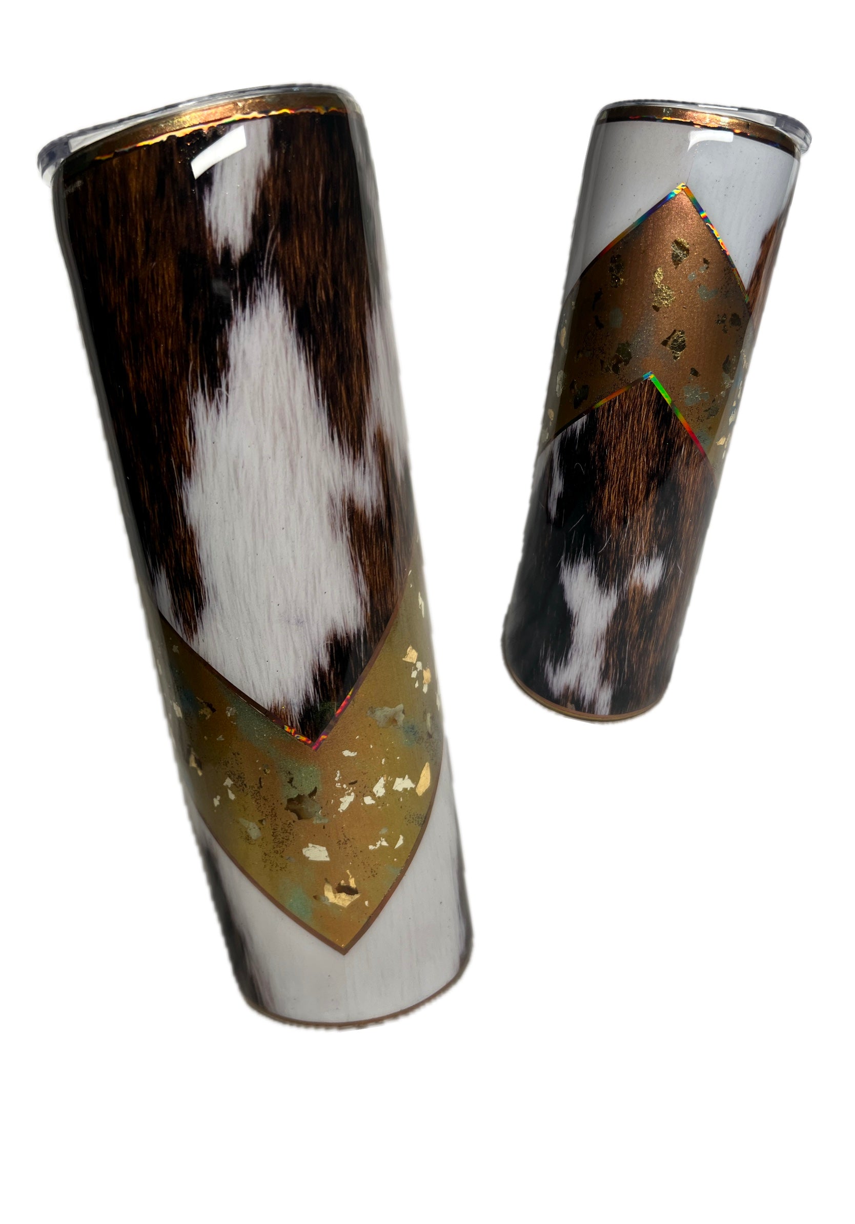 Sip in style with our stainless steel tumbler that's both stylish and practical. Featuring a unique cow hide print vinyl design with accents of gold and copper foils, this 30 oz tumbler will keep your drinks at the perfect temperature while adding a touch of quirkiness to your day.