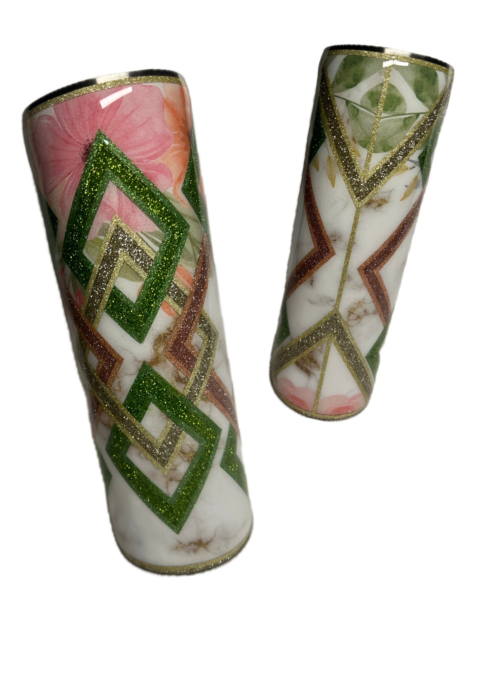 Stay hydrated in style with this 30 oz stainless steel duo! Comes with two lids for any beverage. The soft floral and marble design is accented by a fun mix of green, gold, and rose gold glitter. Perfect for anyone looking to add some sparkle to their day!